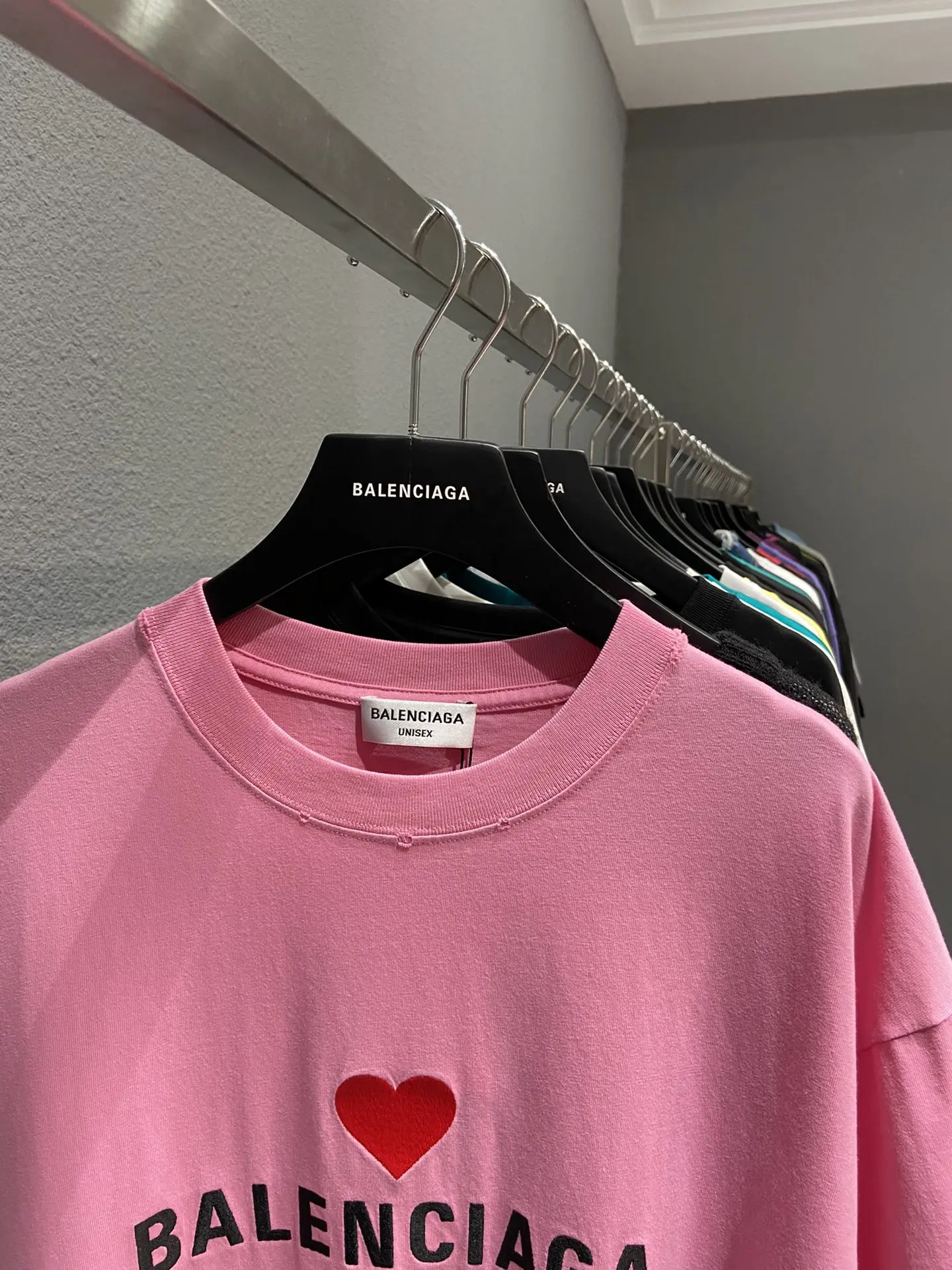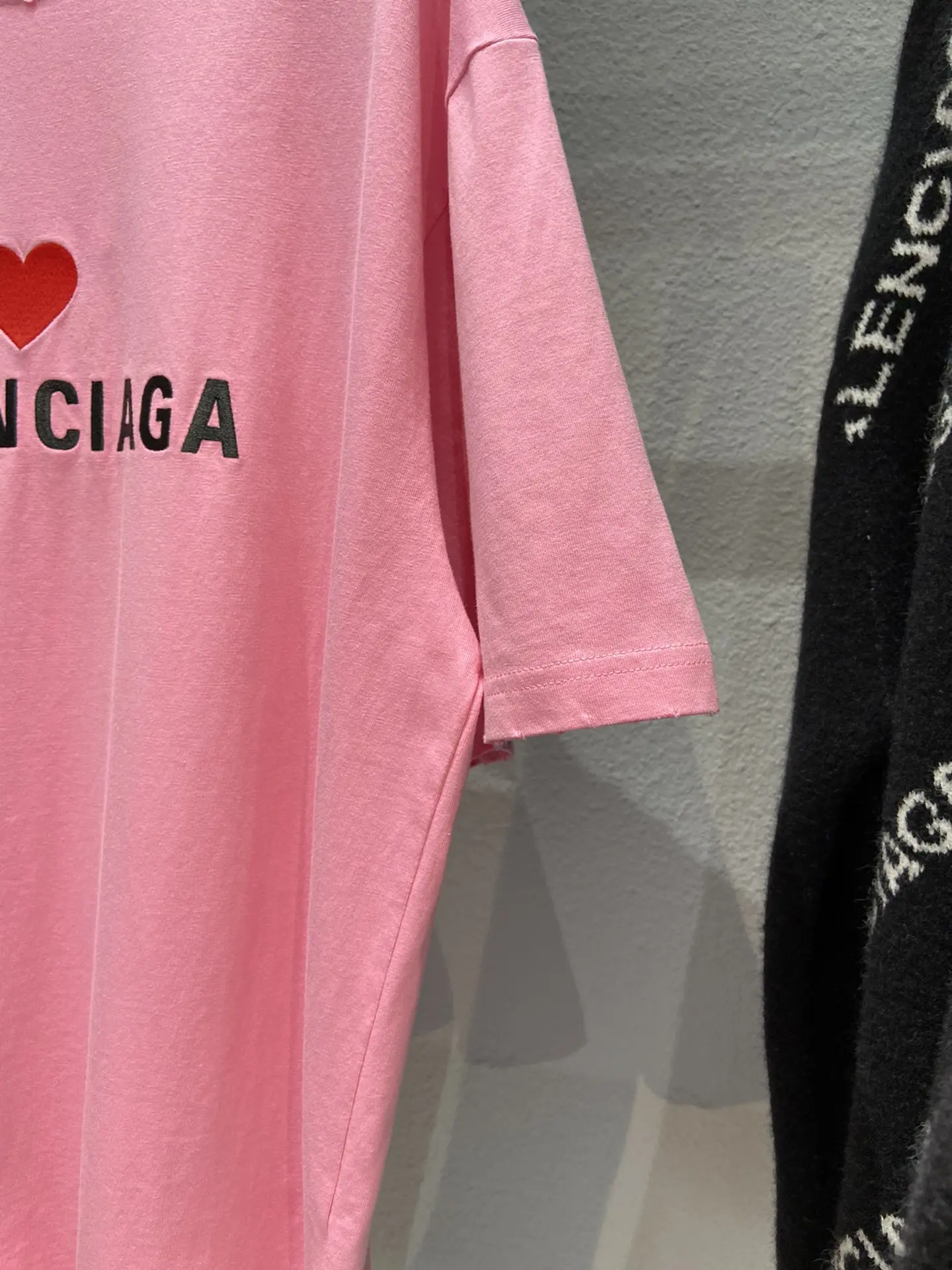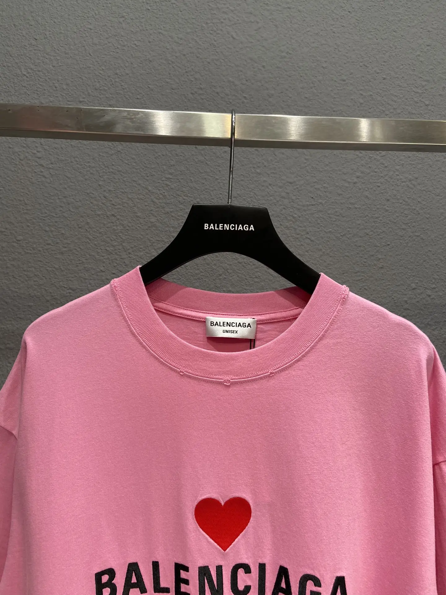 The Balenciaga Paris Heart Tee in pink is a unisex staple featuring a bold heart-shaped logo. Made from soft cotton, it offers comfort and style for everyday wear. A must-have for fashion lovers.