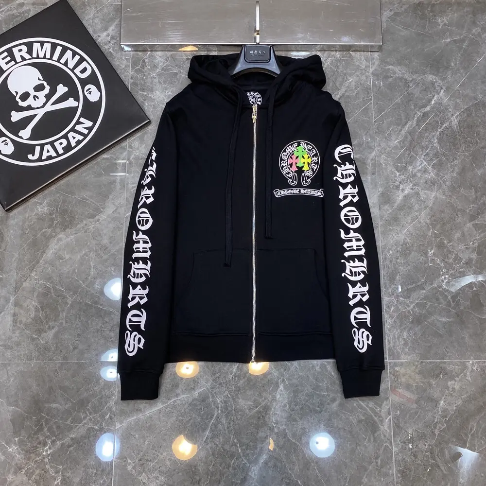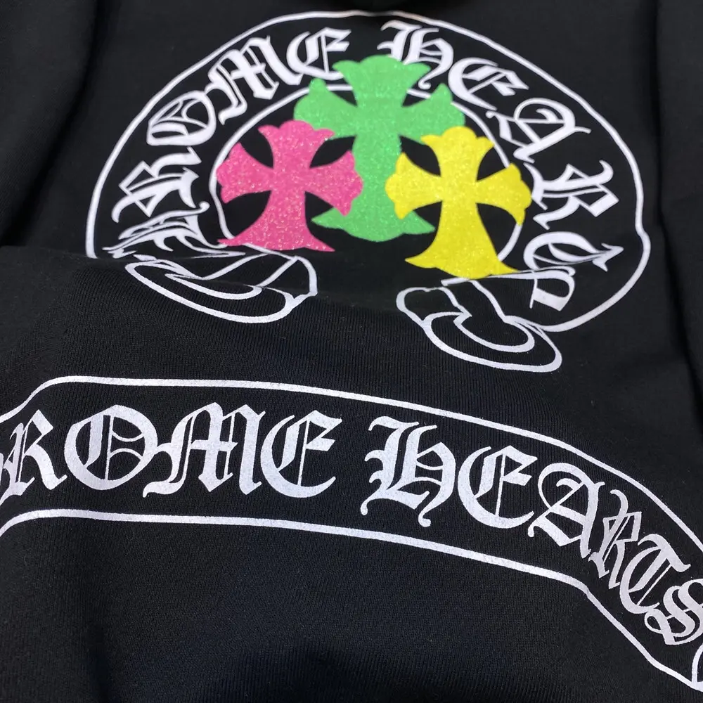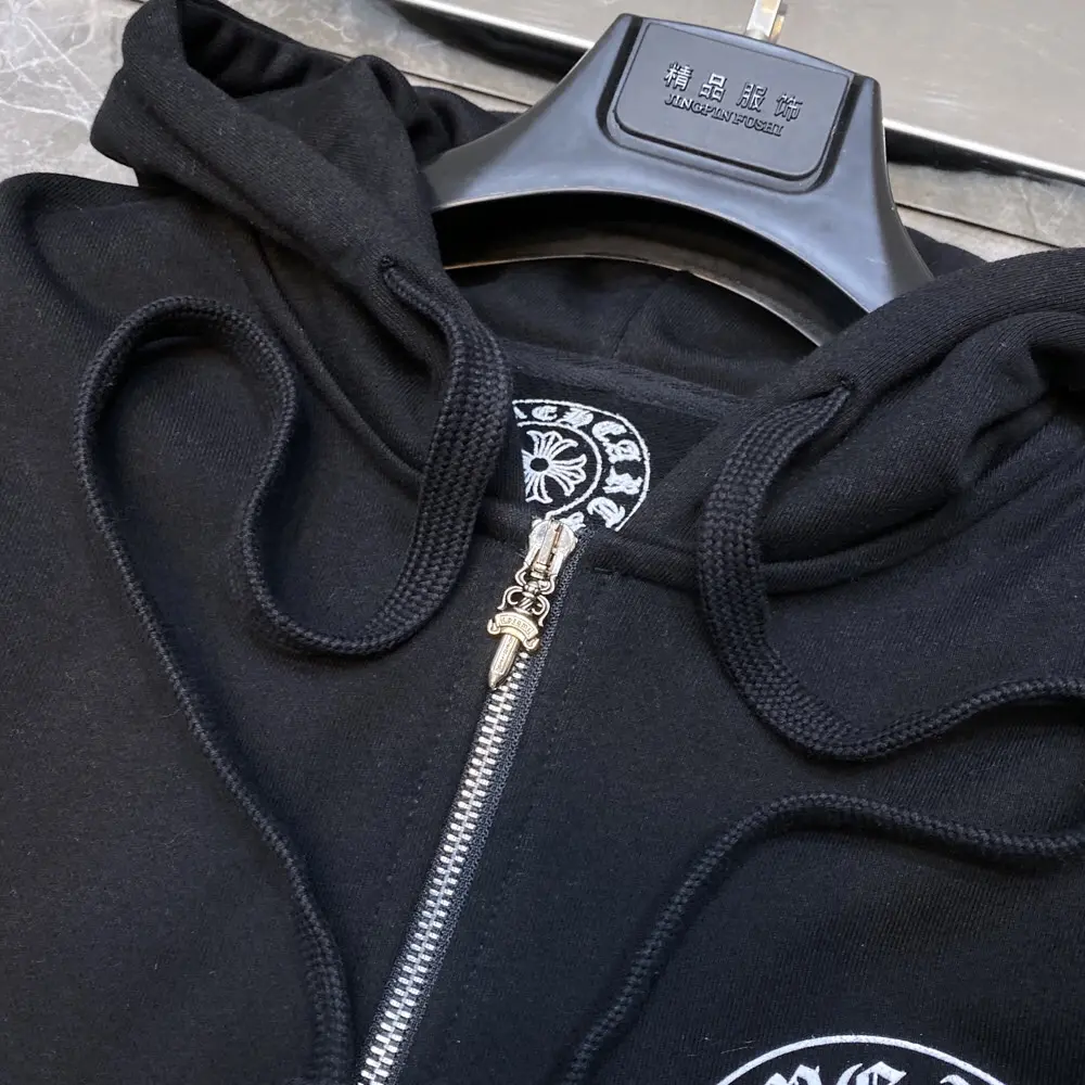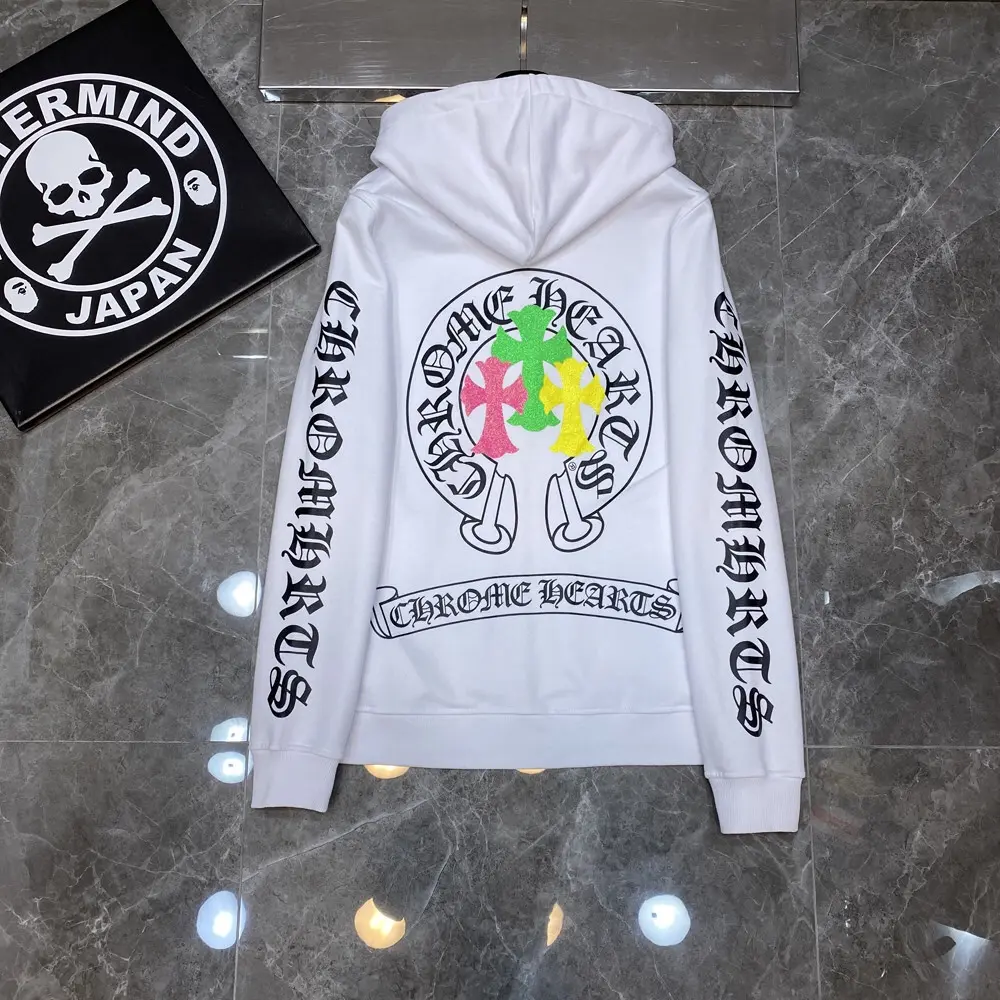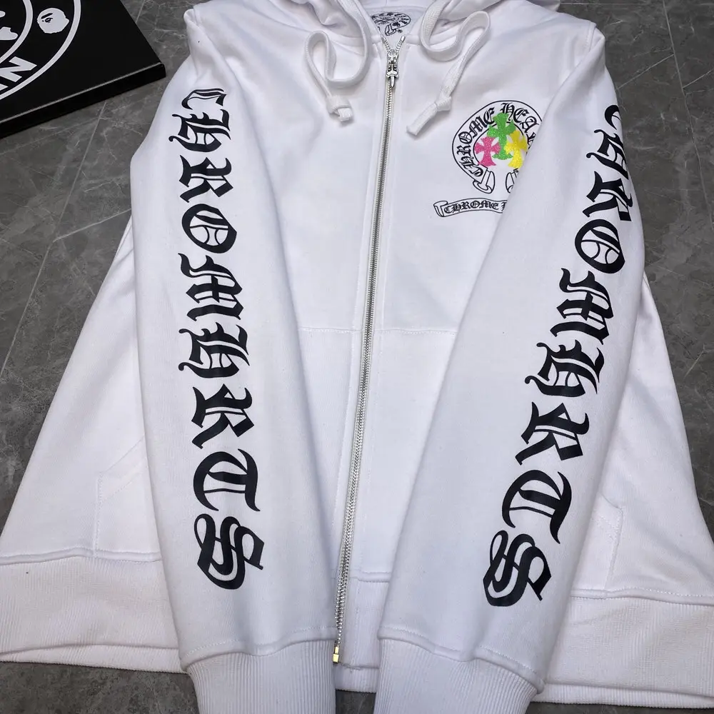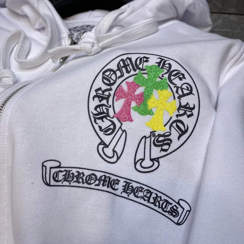 – Streetwear Style: Sleek white hoodie with Chrome Hearts branding for a bold, urban look.